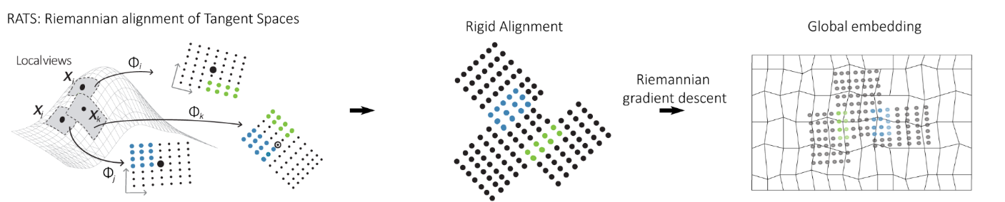 I was recently at a talk by Devika Narain (Associate professor at Donders), and one of the things she presented was their new dimensionality reduction method called RATS (Riemannian Alignment of Tangent Spaces). For some reason it really tickled my brain, so here I'll go through what the problem is and how it's solved by RATS. I'll take a view that isn't necessarily neuroscience focused, as the problem and solution are larger than what their original motivation was.