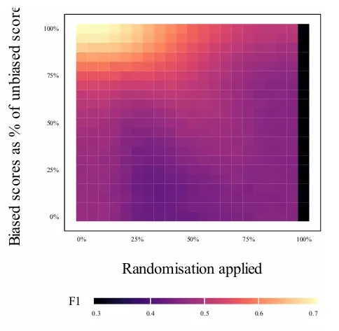 The other finding is about how bias and randomization interact. The researchers made a heatmap of F1 across the full space of possible combinations: how biased the reviews are (y-axis) and how much randomization is applied (x-axis). The clearest pattern is that adding randomization under low-bias conditions reduces F1 smoothly and predictably, which is the intuitive result. What is more interesting is what happens when reviewer bias is stronger: the decline with randomization stops being smooth, and there is a diagonal band of relatively better performance running through the middle of the heatmap, suggesting that under substantial bias, moderate randomization can partially recover decision quality compared to a less randomized but more bias-exposed system. The catch is that the paper deliberately explores parameter combinations in this region that probably would not occur in practice, so the honest summary is probably that moderate randomization costs relatively little decision quality across the realistic parameter space, and the bias reduction benefit can be helpful, but may not be as large.