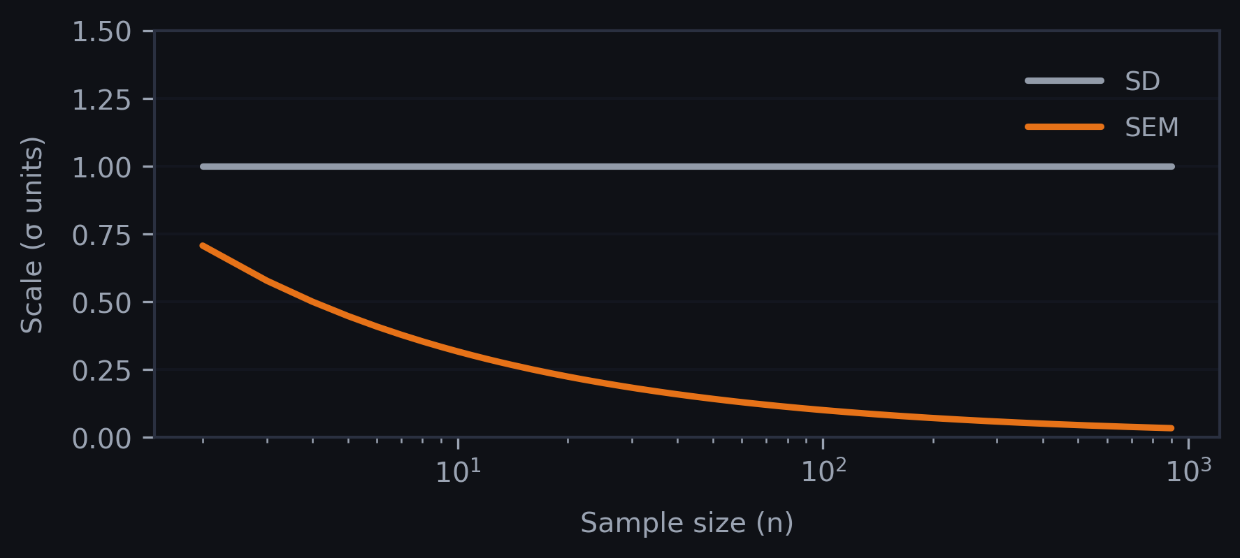 SD is tied to the spread of individual outcomes. SEM is tied to the spread of the mean across (hypothetical) repeats of the study (Curran-Everett & Benos, 2007). Both can be useful, but they communicate different things. In many real-world contexts, individual variation can be the point: patients, cells, and organisms experience outcomes one-by-one, not as an abstract mean.