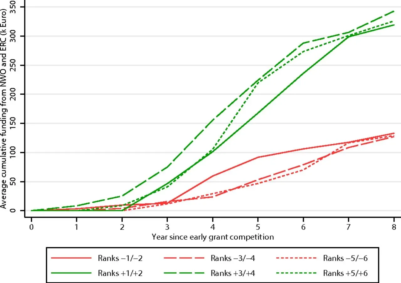 A big piece of evidence here comes from a 2018 PNAS study by Thijs Bol, Mathijs de Vaan, and Arnout van de Rijt, who analyzed data from NWO's Veni program, the early-career fellowship that functions as the primary individual funding route for young researchers in the Netherlands. NWO uses a hard numerical threshold to separate funded from unfunded applications. Applicants just above and just below the cutoff have near-identical review scores, so near the threshold the funding decision can be seen as pretty much random. Based on this, you can compare what happens to those two groups in the years that follow.
