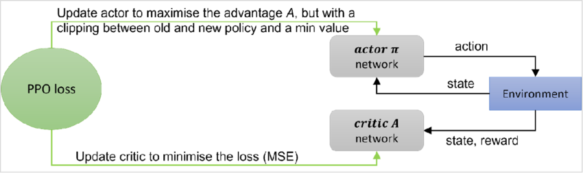 In parallel it trains a value function (the critic), which takes the same position and predicts the expected final result from there, essentially how good the position is if you keep playing the current strategy. PPO uses that value prediction to compute an advantage signal: did this move do better or worse than the value function expected? Finally, PPO limits how much the policy is allowed to shift per update, so learning stays stable and does not collapse from one batch.