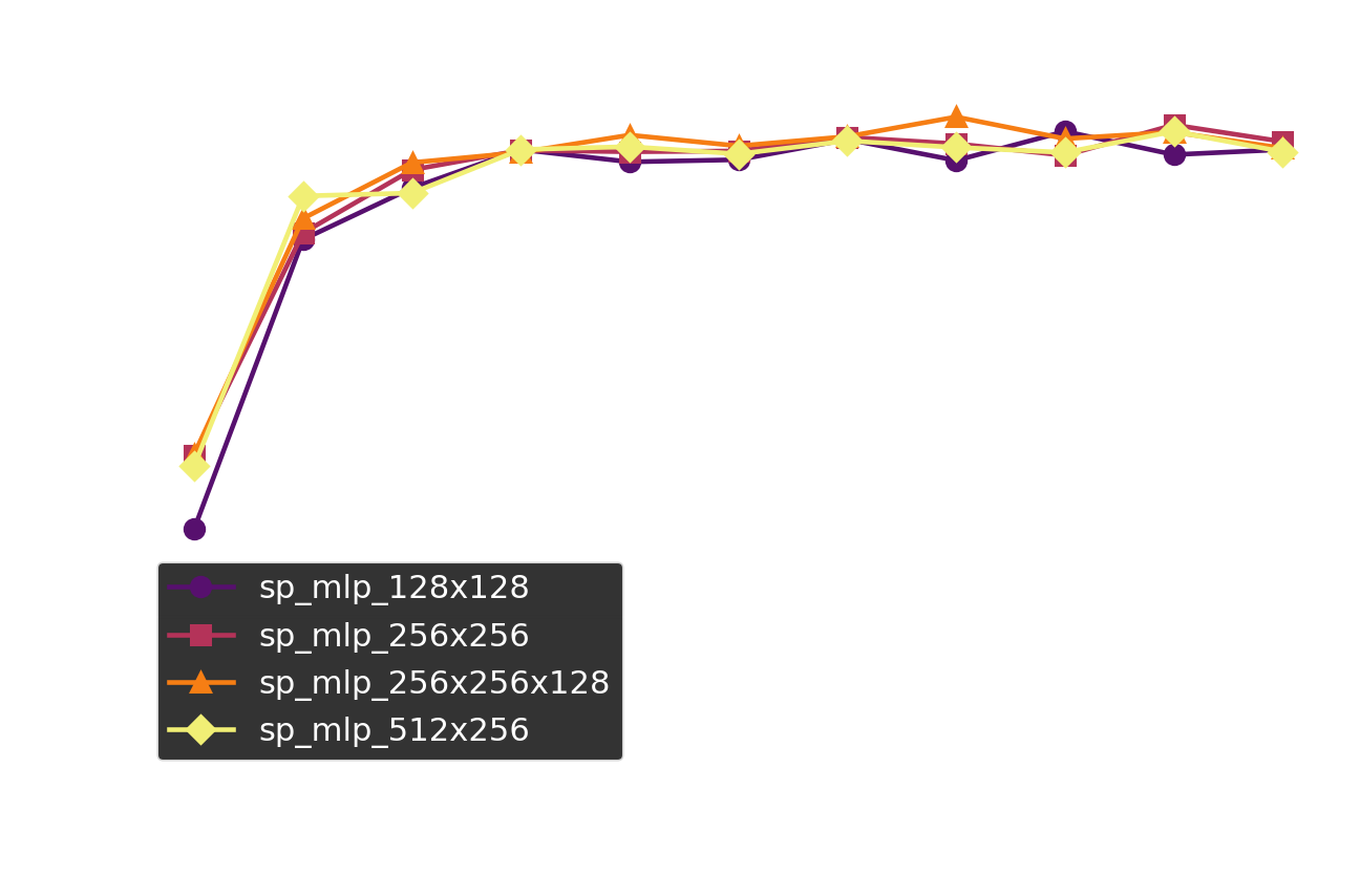 To my surprise, the 128x128 network wins out! It seems the problem is simple enough that a good solution can be found in a relatively small network. One way to check if the bigger networks just needed more time to train, is by looking at the progress they are making during training. An easy to interpret metric is the win rate the model has versus the older versions of the model it is playing against. I simulated 1000 games of the last model versus the older models.