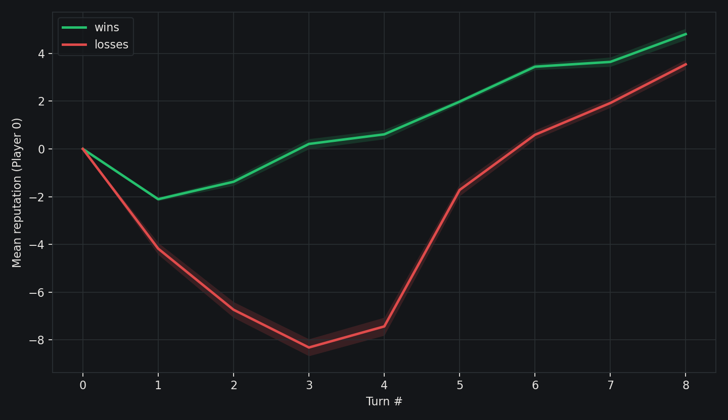 An interesting thing we can do is look at the mean reputation of the stronger player (p0) as turns go on. This of course doesn't require the higher state space, but I thought it was interesting. In wins, the bot usually sacrifices the first round, but not too much. It then on average has a relatively straight path to victory. In losses, it can't quite catch up at the end, but it still ends with a positive reputation. This is of course again not immediately a strategy you should use - it could just be a side effect of the AI playing versus the distilled model, and what tends to work specifically there.